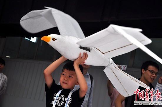 机器人大会现场,一名小朋友体验放飞仿生鸟。中国青年报·中国青年网记者 张茜/摄