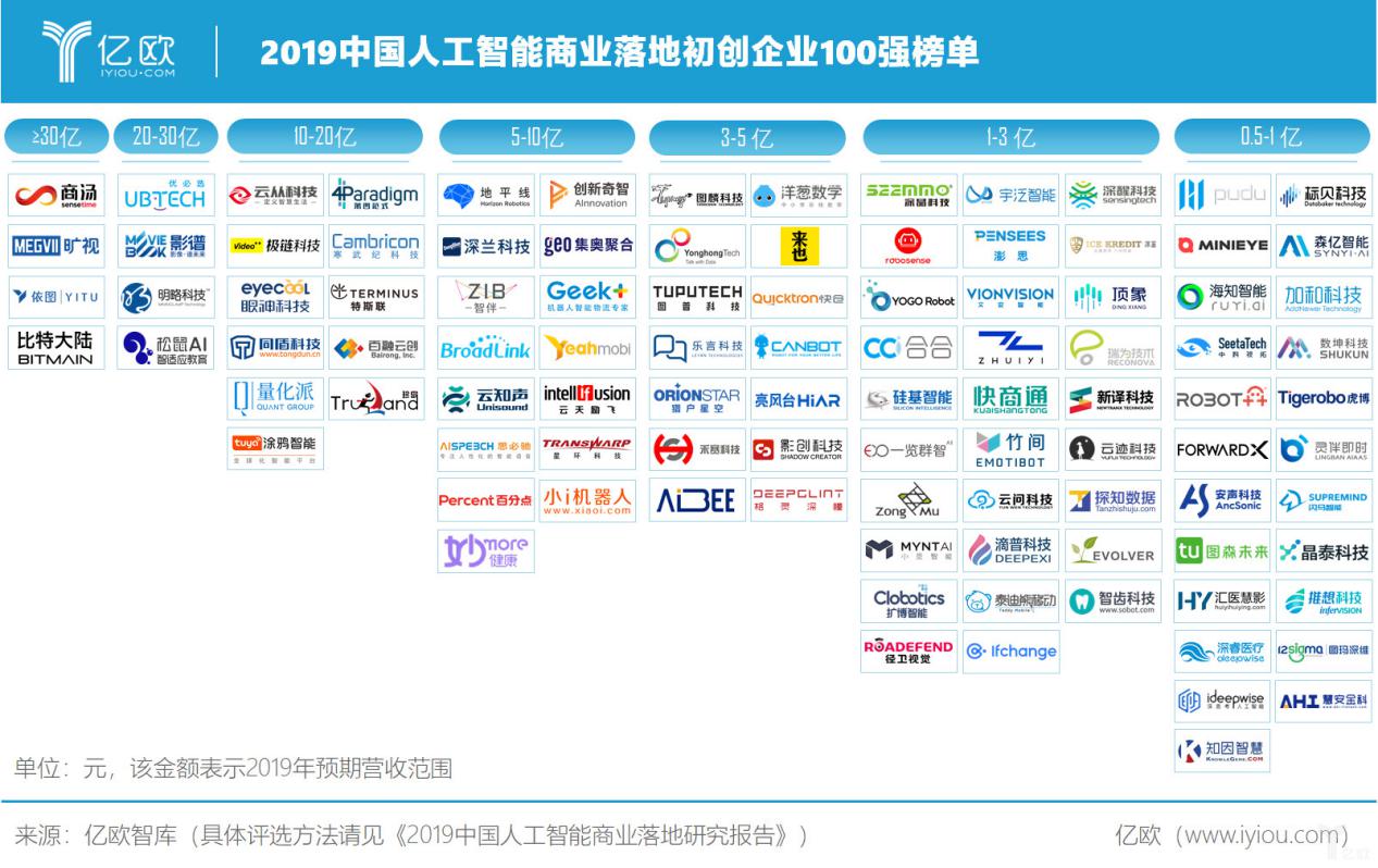 2019年,人工智能的应用落地进一步深化,实现营收规模化增长成为诸多AI企业的主要目标。亿欧智库连续第二年推出“中国人工智能商业落地初创企业100强榜单”,通过企业2019年预期营收这一指标来衡量人工智能初创企业的最新商业化进展。榜单以非上市的、主营业务由人工智能及关联技术驱动的初创企业为样本框,采用企业问卷调研的方法进行一对一获取,并辅以多方验证,形成最终榜单。对于小觅智能、图森未来、云集迹科技等“年轻”企业来说,0.5至3亿的2019年预期收入,也意味着得到了行业内的权威认证。