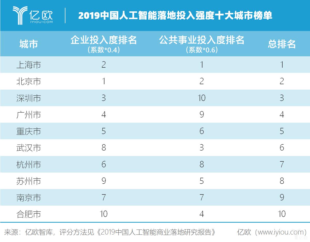 亿欧智库还认为,伴随人工智能领域进入应用落地的阶段,此前聚集于技术密集型、资金密集型城市的AI初创企业,正逐步向经济发达、人口密集、有广阔AI落地场景的城市扩散。亿欧智库从人工智能初创企业的B端客户采购投入,和各地在公用事业(以交通、安防、医疗为主)中投入人工智能的情况两个维度,对城市在2019年1-8月的人工智能商业落地进展进行评估,得出“2019中国人工智能落地投入强度十大城市榜单”。其中,上海、北京、深圳占据前三,广州、重庆紧随其后。