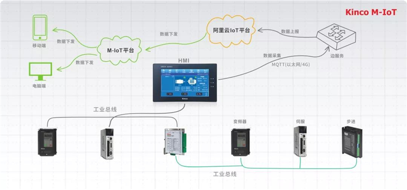 步科推出M-IoT机器物联网解决方案,通过工业现场总线,将PLC、变频器、伺服驱动器、步进驱动器等的运行数据上传至HMI或边缘服务器,再通过MQTT协议,将核心部件的运行数据上传至云端,使得现场运维人员可以通过手机、平板电脑或其他无线设备远程访问设备信息,获取实时在线数据,从而实现故障预诊断分析、远程监控等多种智能服务,帮助用户及早发现设备早期故障、减少避免重大损失、有限延迟设备寿命、降低运维管理成本、提高生产效率。