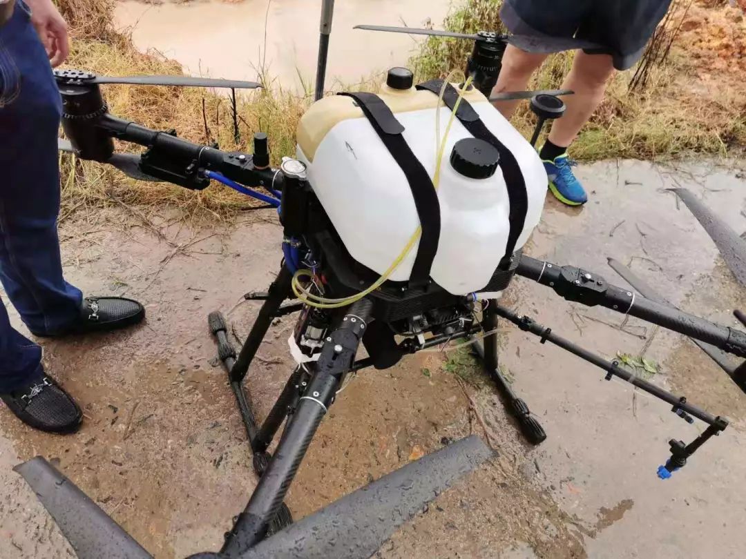 演示当天下起中雨,不过对于华科尔油电混合植保机来说不是问题,因为整机各个关键部位都已进行了防水保护,就是为了后期方便用户在作业后用水清理污渍。