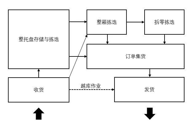 1、收货与上架:对来货进行入库前卸货和接收;对货物数量和质量进行验收;将货物进行上架作业,搬运货物,并将其放置于指定存储位置。部分仓库具有越库流程,将入库的货物直接从收货区搬运至发货区,即一收货就开始履行订单。