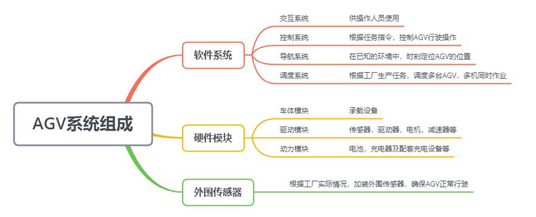 从系统构成看,AGV系统主要包括三大部分,即软件系统、硬件模块及外围传感器。其中,软件系统主要包括:交互系统、控制系统、导航系统和调度系统;硬件模块主要包括:车体模块、驱动模块、动力模块;外围传感器包括:红外传感器、超声波传感器等。