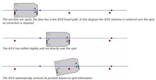 磁点和AGV传感器来自AMERDEN AGV的Immage,每个250-500毫米(接近15英尺)安装磁点,形成虚拟路径。AGV使用传感器控制从一个点到下一个点,例如霍尔效应传感器,编码器,计数器,陀螺仪传感器和其他类型的编码器,以校准转向角误差。