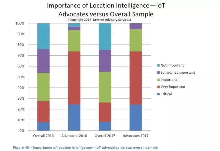 74%的物联网早期采用者表示,位置智能至关重要。相反,德累斯顿咨询服务公司(Dresner Advisory Services)的报告中,只有26%的总体样本将位置情报列为同等重要的级别。基于iot的位置智能最有前途的用例之一是它在高度管制的制造业中简化可跟踪性和库存管理遵从性工作流的潜力。预计在2018年,ERP和库存管理软件供应商将推出利用物联网位置智能的新应用程序,以简化全球范围内的可追溯性和供应链合规。
