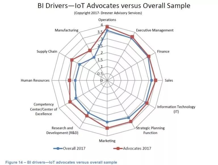 制造和供应链管理,包括库存管理和商业智能能力中心(BICC)是企业采用物联网的最有力的催化剂之一。下图中定义的BI采用的12个功能驱动因素的活动水平越高,物联网根据不同地区的独特需求提供差异化价值的潜力就越大。 包括库存管理在内的供应链管理是物联网应用中最活跃的早期采用者,其次是营销、销售和战略规划。在战略规划的上下文中,这12个采用领域与公共数据捕获、聚合、报告和性能改进目标同步。供应链是任何企业的命脉,它将12个领域统一为一个统一的、有凝聚力的战略。