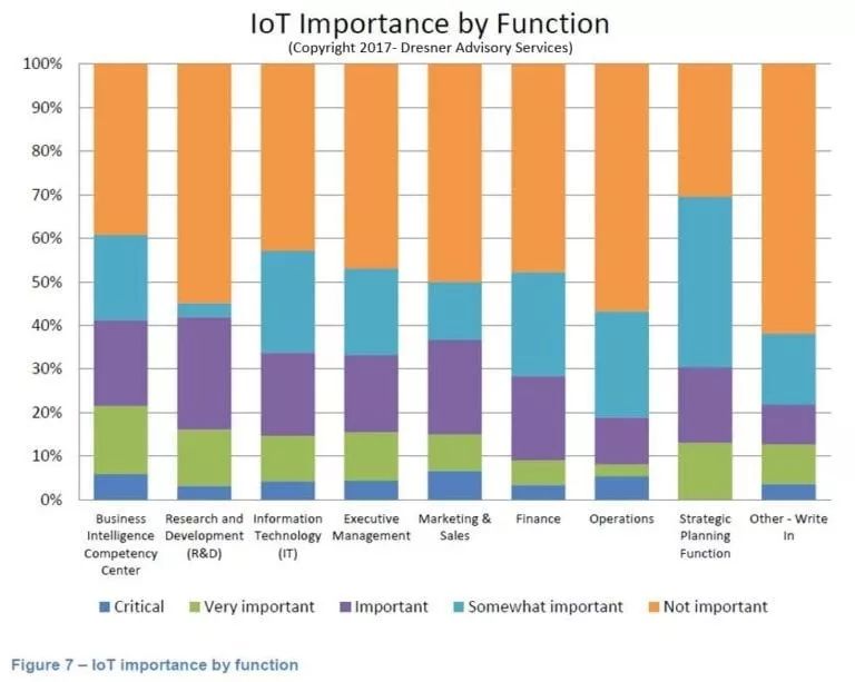 制造业、咨询、商业服务和物流配送是目前引领物联网应用的四大行业,并将在2020年前加速。德累斯顿咨询服务公司(Dresner Advisory Services)最近的一项研究发现,物联网最大的潜在价值在于简化最复杂的制造过程,包括配送、物流和仓库管理。物联网的早期采用者通常定义的目标具有明确的收入和竞争优势,以推动计划。制造业、咨询、商业服务和分销/物流代表着具有挑战性和竞争力的行业,这些行业的收入增长往往难以实现。提供收入和竞争优势的物联网计划是最快、最有可能获得资金和支持的。德累斯顿咨询服务公司(Dresner Advisory Services)的《2017物联网(IoT)智能市场研究》(2017 Internet of Things (IoT) Intelligence Market study)总结了行业对物联网重要性的研究,并在《福布斯》(Forbes)上发表了如下图表: