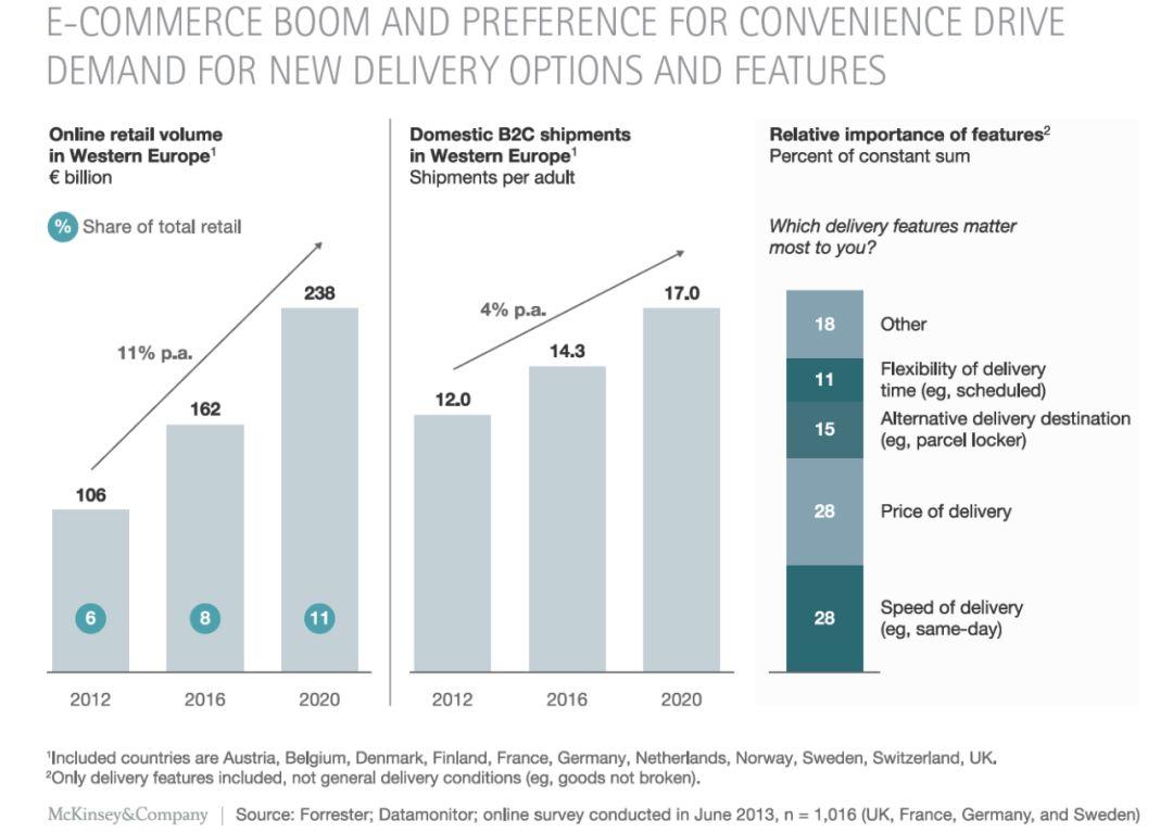 目前已经给供应链造成重大破坏的最大趋势之一是电子商务的持续增长。在欧洲,电子商务在零售中的平均份额在2015年为7%,2016年为8%,预计2017年将达到8.8%。在全球范围内,零售电子商务预计将增加到零售总额的14.6%,市场规模将超过4万亿美元(eMarketer,2016年)。