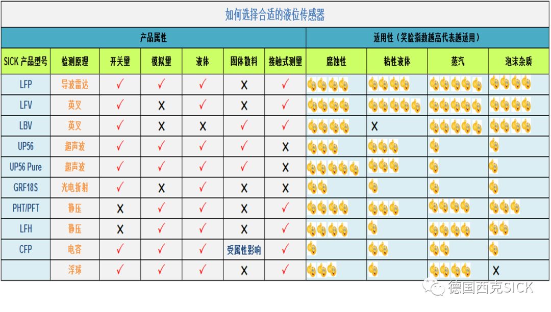 当我们了解了不同检测方式的优缺点以后,对于液位传感器的选择也逐渐有了清晰的概念。(具体可参考下图表格)首先,在开始选择之前,必须先清楚我们需要传感器达到哪些功能?是属于开关量输出还是模拟量输出?通常开关量/数字量输出用于报警或者保护作用,例如灌装时防溢报警、低液位防泵空转保护等;模拟量输出主要用于过程控制,包括灌装容量、液位显示、加料速度控制等。