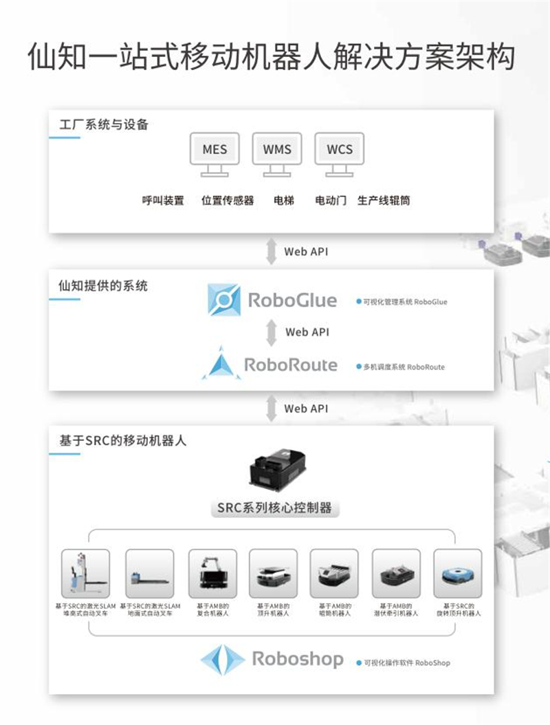 仙知机器人通过多年经验积累,掌握了具有自主知识产权的移动机器人核心技术,形成了以软件与硬件为一体的一站式移动机器人解决方案,软件包括对接工厂上位系统的可视化管理系统RoboGlue、多机调度系统RoboRoute、单机操作的可视化操作软件Roboshop;硬件包括移动机器人最强大脑SRC系列核心控制器和基于SRC的各类移动机器人。