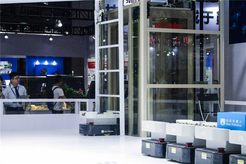 当前,由于大多企业车间和仓库是多楼层布局,实现物流自动化运输需要机器人通过电梯、电动门等设施,解决与电梯、电动门的通讯及让机器人安全运行成为移动机器人应用一大难题。仙知机器人不仅解决了这一课题并且将解决方案搬到了展会现场呈现给大家,让现场观众及客户直观感受。
