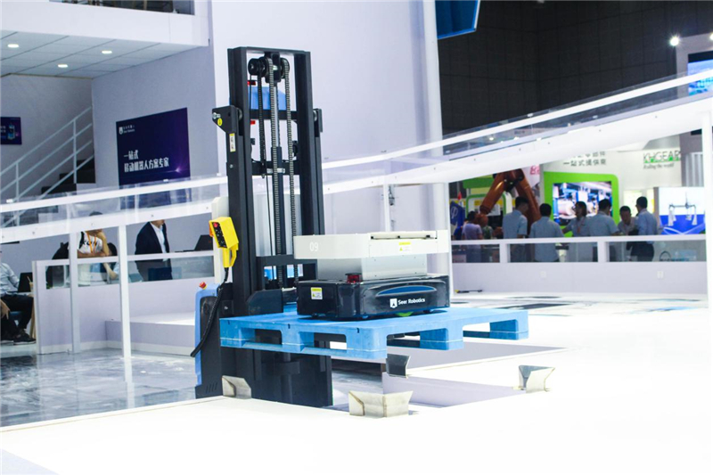 安全是用户在选择移动机器人时要考虑的第一准则。在仙知机器人展台,现场演绎了基于SRC的激光SLAM堆高式自动叉车安全可靠的优势及精准叉取货物的强大性能。