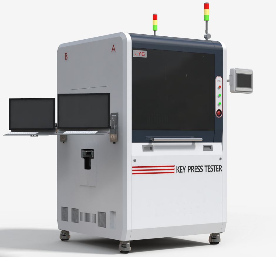 自主设计的电磁铁敲击模组,敲击力度可调节,可模拟人手指自由落体的敲击方式,并可设定不同的力度按压键盘。可实现双工位同时测试,并作为在线式机台连接其他种类键盘测试机型(手感、背光、丝印等)形成完整自动化产线。