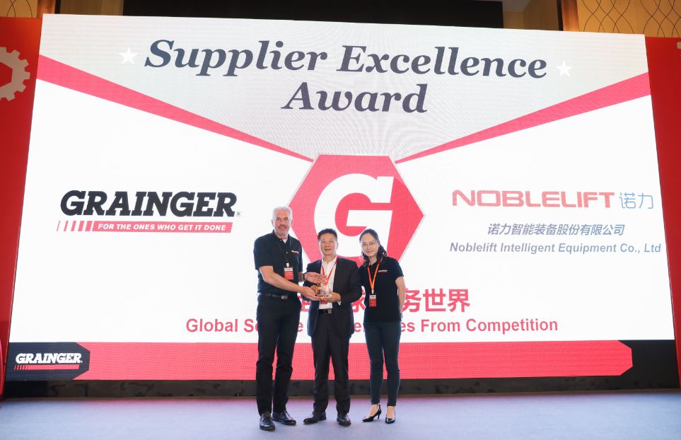 在本次大会上,Grainger(固安捷)的供应链管理高级总监Johan Dewandeleer 先生和采购部经理Jacqueline Min女士共同上台为诺力股份颁发了奖项,并表示了对诺力的感谢, 十分认可诺力一直走在Grainger(固安捷)需求的前面,为他们所遇到的每一个困难提供周全的解决方案。