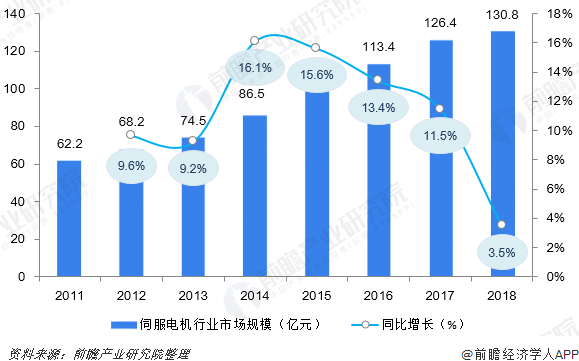 通过测算,2018年,下游市场需求对伺服电机市场增长贡献率为3.5%左右,按此增速,2018年,中国伺服电机的市场规模为130.8亿元。