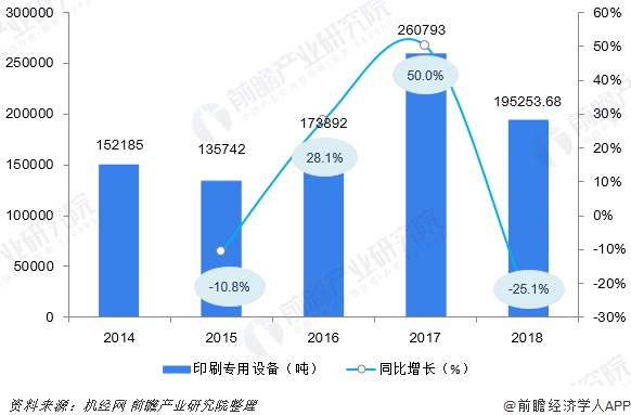 图表3:2014-2018年中国印刷专用设备产量(单位:吨)