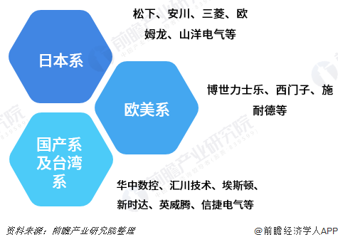 中国伺服市场分为日系、欧美系、台湾系、国产品牌四个阵营。日系品牌凭借良好的产品性能与极具竞争力的价格垄断了中小型OEM(设备制造业)市场,以松下、安川、三菱为代表;西门子、施耐德、博世等欧美品牌占据高端,下游以大型机械为主;台湾品牌产品价格和技术水平定位于外资品牌和国产品牌之间,以台达及东元为代表;国产企业以汇川技术、埃斯顿、广州数控为代表,产品功率范围多在22KW以内,技术路线上与日系产品接近,整体竞争力不断提高。