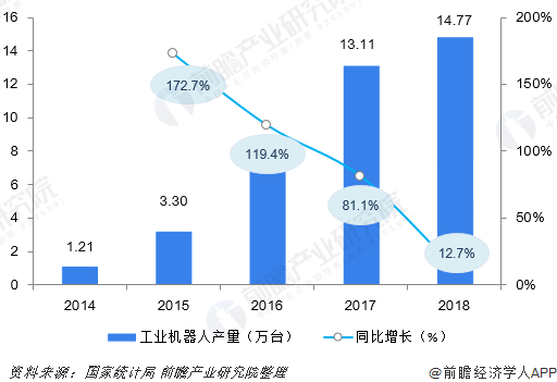 根据国家统计局数据,2018年,中国工业机器人产量为14.77万台,同比增长12.7%,根据中国电子学会数据,2018年中国服务机器人市场增长约为43.9%,2018年整体机器人市场增速在22%左右。