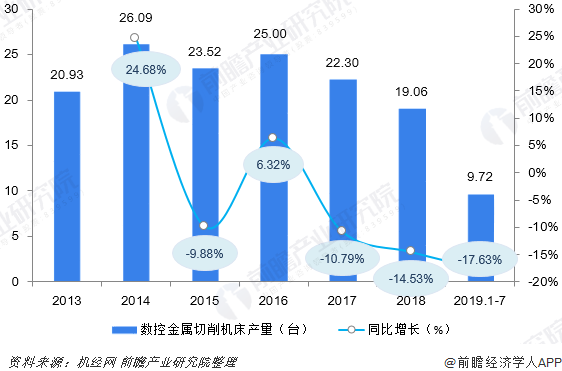 图表2:2013-2019年中国数控金属切削机床产量(单位:台,%)