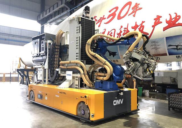 OMV移动机器人具有激光自动导航功能,运行路径可以自由规划,无需铺设轨道,叶片打磨长度由OMV定位来定,可以覆盖所有长度叶片,可进行长50-80米(可调节),高5米范围内的预弯叶片打磨工作,可以打磨各种型号的叶片,全程自动打磨,作业过程中无需人工操作。