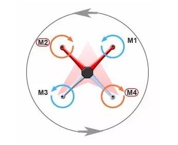 但是当要飞机原地旋转时,我们就可以利用这种反扭矩,M2、M4两个顺时针旋转的电机转速增加,M1、M3号两个逆时针旋转的电机转速降低,由于反扭矩影响,飞机就会产生逆时针方向的旋转。