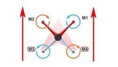 如下图所示,三角形红箭头表示飞机的机头朝向,螺旋桨M1、M3的旋转方向为逆时针,螺旋桨M2、M4的旋转方向为顺时针。