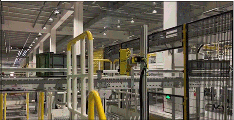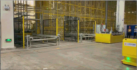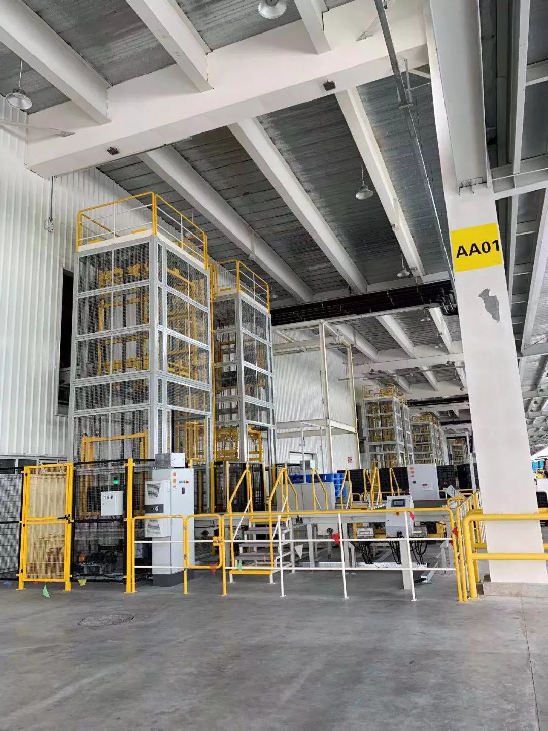 便是物料入库的地方。物料入库前,系统会自动扫扫码,实现信息可追溯。之后,物料将被自动传送,并抬升到“楼上”,实现无人入库。