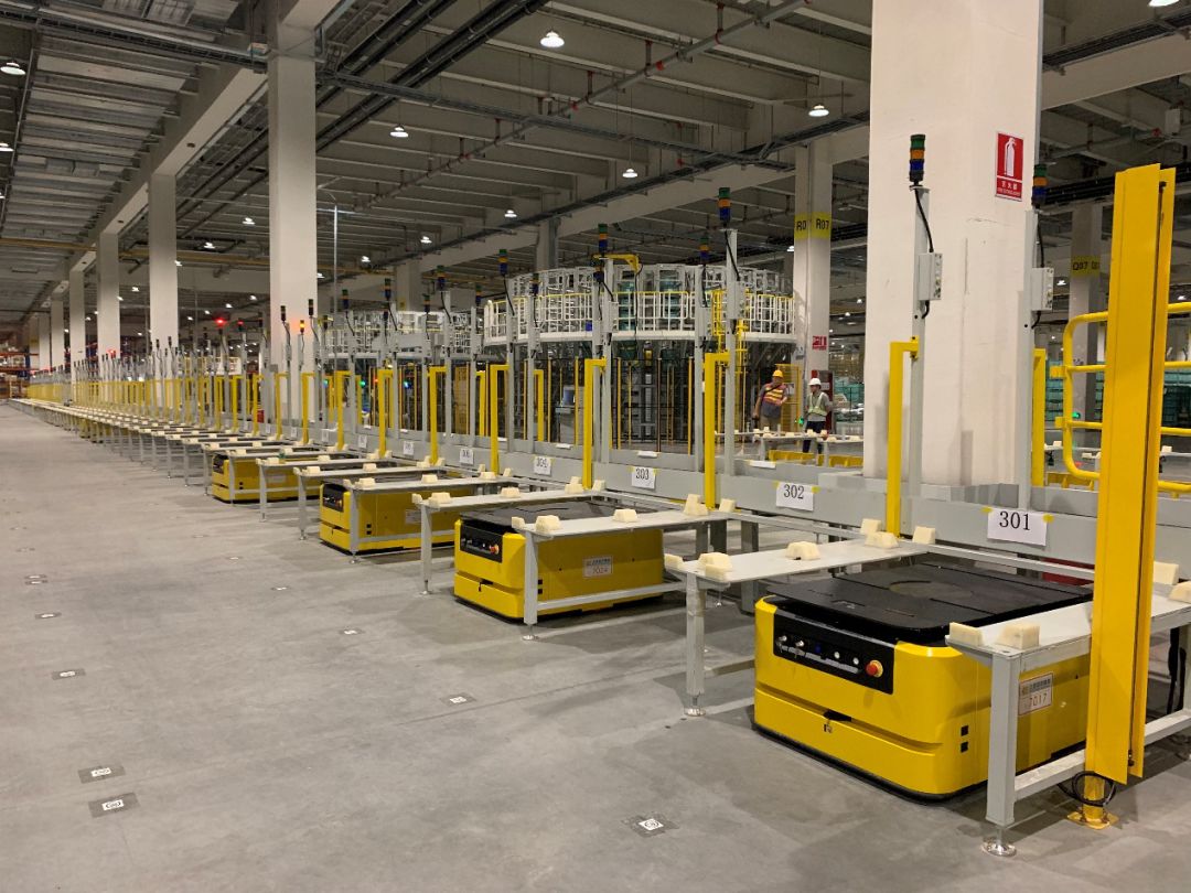 在分拣环节,AGV(无人搬运车)接受指令后,会到相应的仓库为取货,然后送到物料分拣区域
