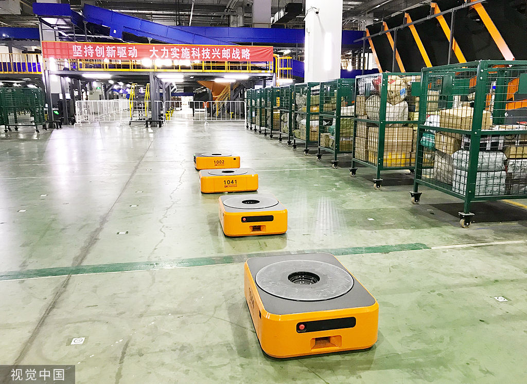 ▲在北京邮政综合处理中心,圆形底盘的智能机器人正“驮着”一箱箱货物穿梭在厂房内,平稳准确地将货物送达到指定地点