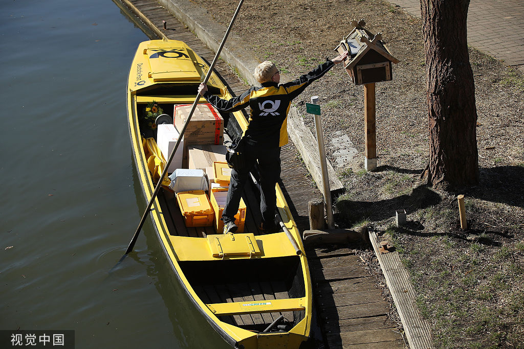 ▲2018年4月,德国邮政工作人员Andrea Bunar划独木舟送邮件