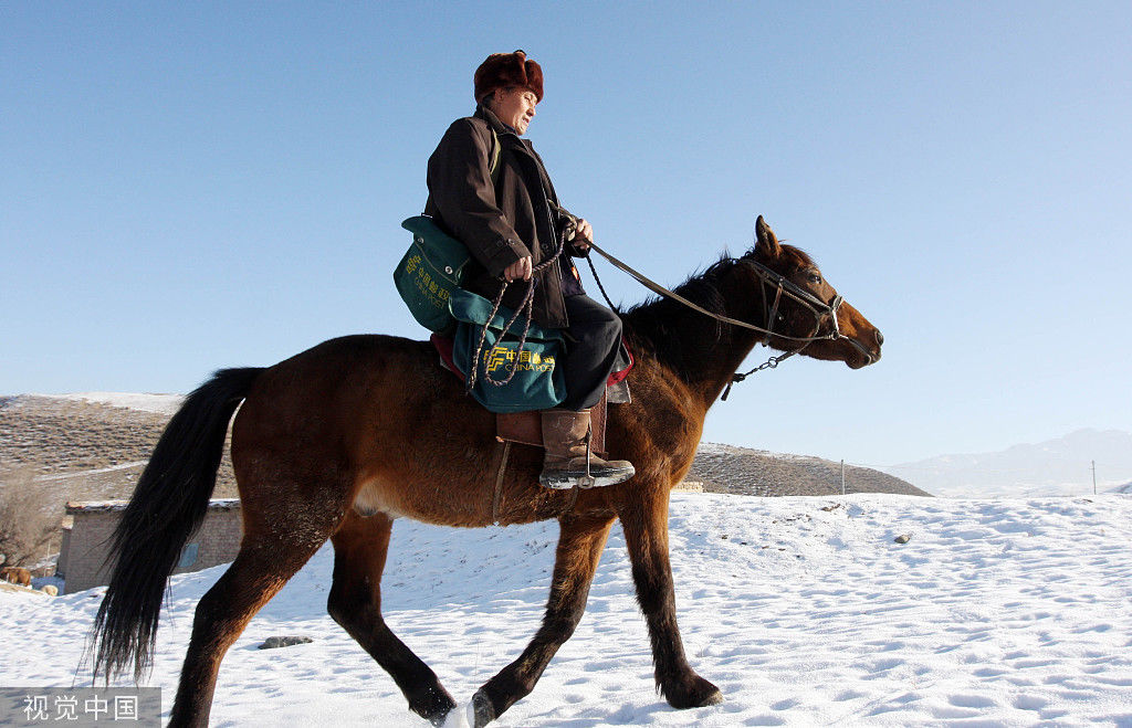 ▲2010年12月,乌鲁木齐市米东区柏杨河乡柏杨河村的赛里哈孜·热合曼肩挎邮包牵着马在妻子艾扎的目送下准备上路去给乡亲们送邮件