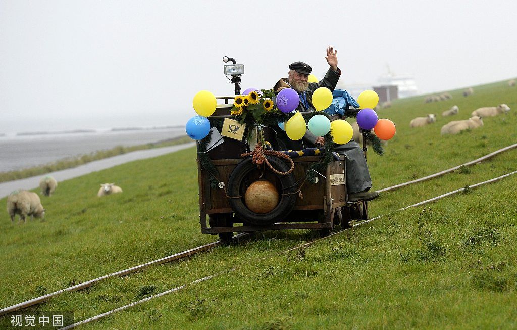 ▲2014年9月,德国汉堡,64岁官方邮递员Fiete Nissen结束自己37年的邮差生涯,沿轨道驾驶小车完成最后一天的工作