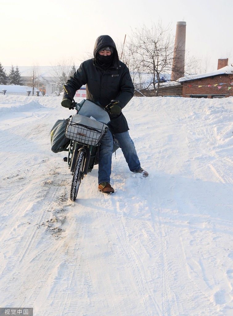 ▲2013年02月,迎着清晨的第一缕晨光,黑龙江黑河市邮政局乡邮12段道的邮递员李斌开始了一天的投递工作