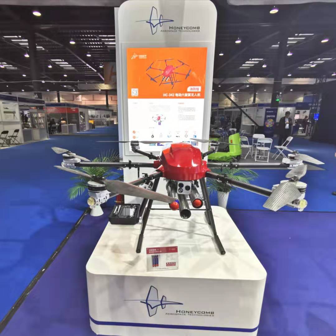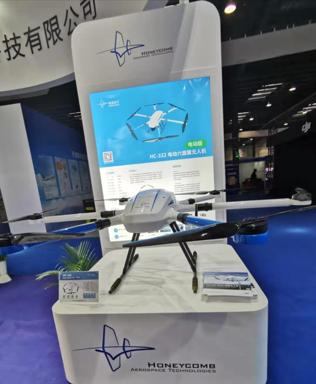 本次参展的是HC-332电动多旋翼无人机,同时公司还拥有HC-332油电混合动力多旋翼无人机。这款飞机也是公司2019年所发布的新品,同时也是继上一代之后,蜂巢产品研发部经过上一代产品的技术积累以及一年多的方案论证、设计研发、功能试验、环境试验等一系列产品研发测试后的一款不错的产品。值得一提的是,HC-332油电混合动力无人机是诸多用户备受喜爱的一款产品,其具备4小时超长航时、载重量大、可靠性高、平台通用、抗风雨等行业领先优势。现如今,这款产品已经在大气监测、电力巡检、石油天然气管道巡检、铁路巡检、安防侦查、国土测绘、等多种领域做出贡献。