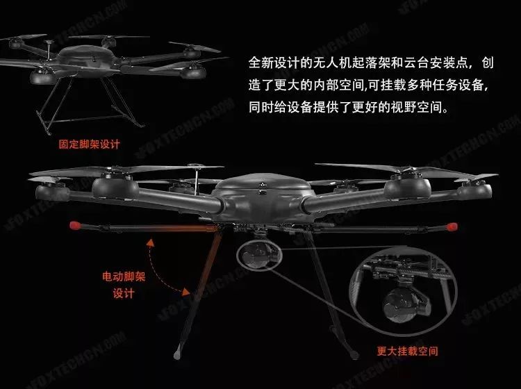 整体架构布局合理 扩展性强充分考虑到以后的系统扩容需求,瑞亚160在传输和控制端都留有一定的扩展容量。除此之外,全新设计的无人机起落架和云台安装点,创造了更大的内部空间,可挂载多种任务设备,同时给设备提供了更好的视野空间。
