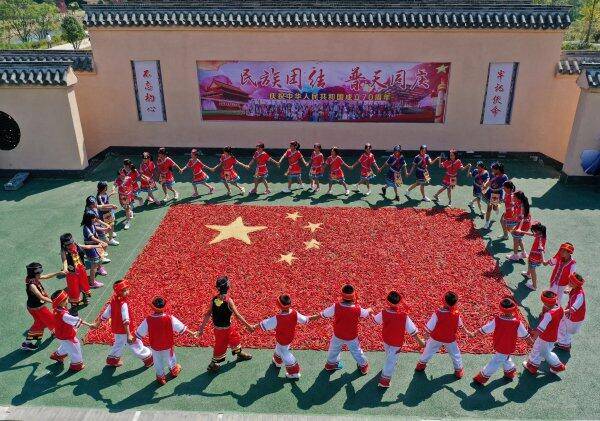 9月26日,信丰县田垅畲族村内广场上,村民用480斤红辣椒、30多斤稻谷“晒出”五星红旗,喜迎国庆。