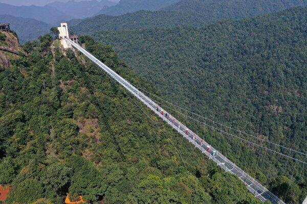 9月28日,赣州市安远县三百山景区350米长的玻璃索桥上演旗袍秀