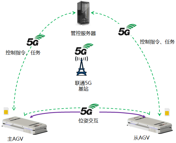 产品采用5G通信技术,联通管控与各台AGV间的通信,协同模式采用管控系统统筹所有AGV宏观运动状态,同时,为多台AGV分别分配主/从AGV角色,从AGV跟随主AGV进行微观运动调整。基于5G通讯低延时,高并发、稳定可靠的优势,实现多AGV高精度、稳定可靠地协同作业。