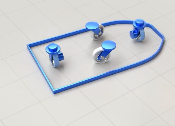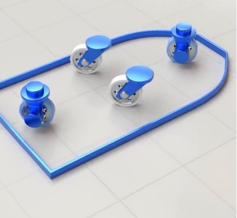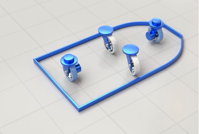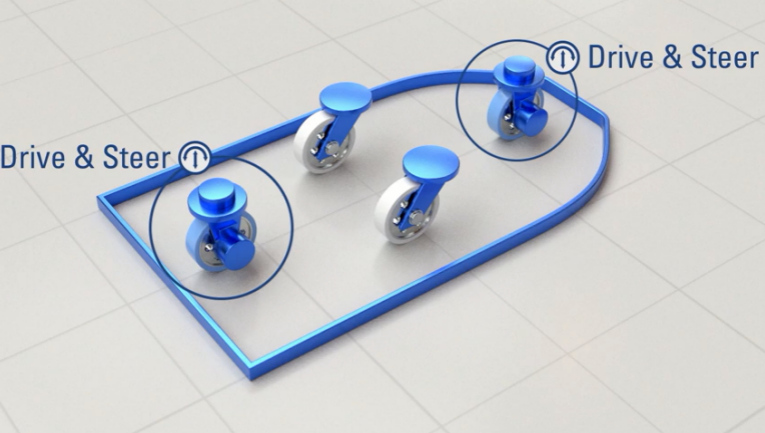 运动设计。运动系统包含2台舵轮和若干个万向轮,舵轮是带转向和行走功能的动力总成,车体结构如下图所示。