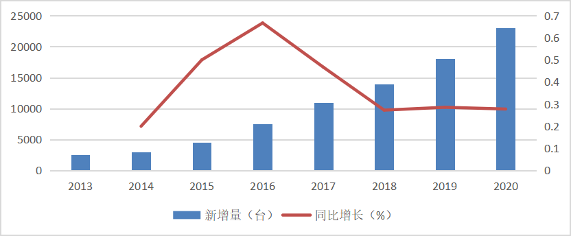 AGV(Automated Guided Vehicle)即“自动导引运输车",是指装备有电磁或光学等自动导引装置,它能够沿规定的导引路径行驶,具有安全保护以及各种移载功能的运输车,AGV优势包括:1)自动化程度高:2)充电自动化;3)美观,提高观,赏度,从而提高企业的形象;4)方便,减少占地面积,生产车间的AGV小车可以在各个车间穿梭往复。随着物流系统的迅速发展,AGV的应用范围不断扩展,AGV系统能够广泛运用于工业、军亊、交通运输、电子等领域,具有良好的环境适应能力。近年来,在国内工业机器人需求量激增以及“中国制造2025”、智慧物流等各项政策的保驾护航下,我国AGV机器人销售量持续增长。