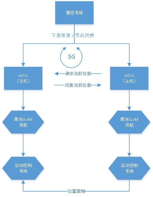 AGV间交互协同。每台AGV因为执行电机、驱动器、地面平整度等因素的差异,即使由管控系统保证了同一时刻启动执行相同任务,但是任务执行过程中,也必然存在差异,从而造成任务执行过程的同步偏差。为了控制这类同步偏差,增加AGV层面信息交互,从AGV会根据主AGV的当前位姿,实时调整自身行走速度与方向,来保证单项任务执行过程中,同步偏差控制可接收范围内。