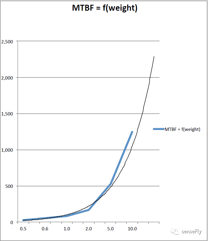 如上图所示,可以看到MTBF在无人机重量小于0.7kg(小于30小时)的值非常低,即0.7kg以下的无人机对地面碰撞所产生的影响很小,而重量超过2kg的无人机,它的值会急剧增加(10kg的无人机为1,255小时),对地面的影响就越大。