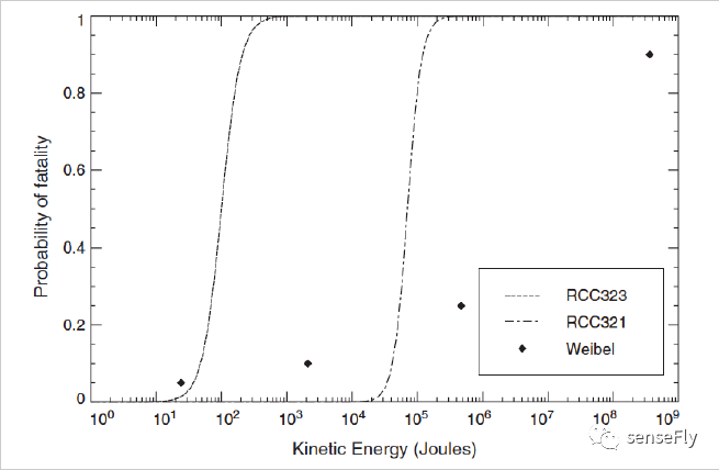 轻小型无人机(比如eBee之类)产生的动能,如果它们以巡航速度击中未受保护的人员,所导致的伤害不到以上值的10%(根据美国陆军指挥官委员会的动能与概率模型)。