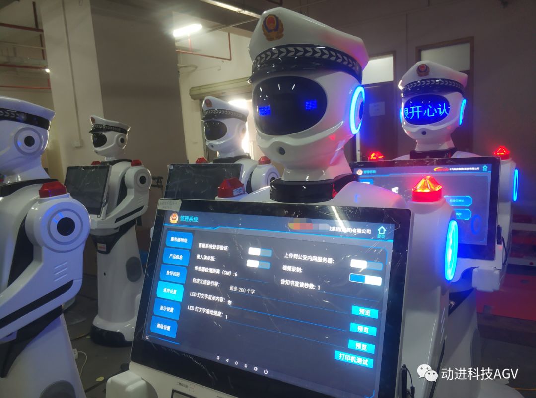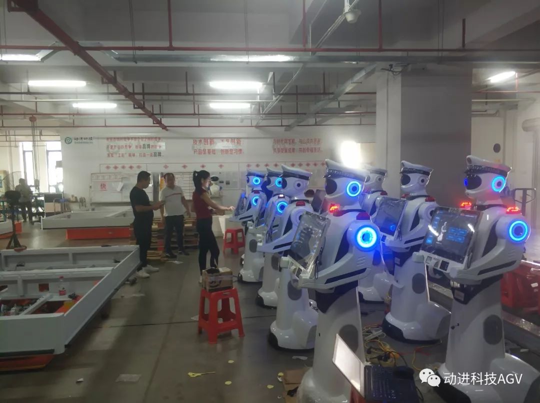 图/动进AGV车间正在出厂前测试多台警用机器人