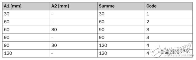 通过磁块标记距离导航磁条中心的距离来表现不同的代码,如下表