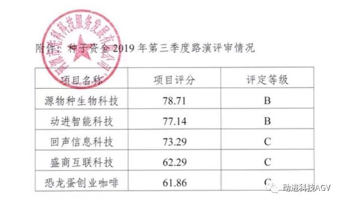 本次种子资金专家评审委员会成员由高新区科技创新局、财政局、投资促进局、先科公司负责人组成,同时,邀请了三名风投机构的专家参与。活动现场气氛热烈,专家们对动进智能的入孵项目路演给予了一致好评,经过紧张而严格的评审,先科公司关于种子资金2019年第三季度路演评审情况的公示出炉,动进智能科技取得了不菲的成绩(B级,排第二)。