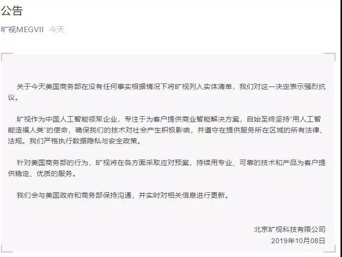 北京旷视科技有限公司公告称, 关于今天美国商务部在没有任何事实根据情况下将旷视列入实体清单,我们对这一决定表示强烈抗议。