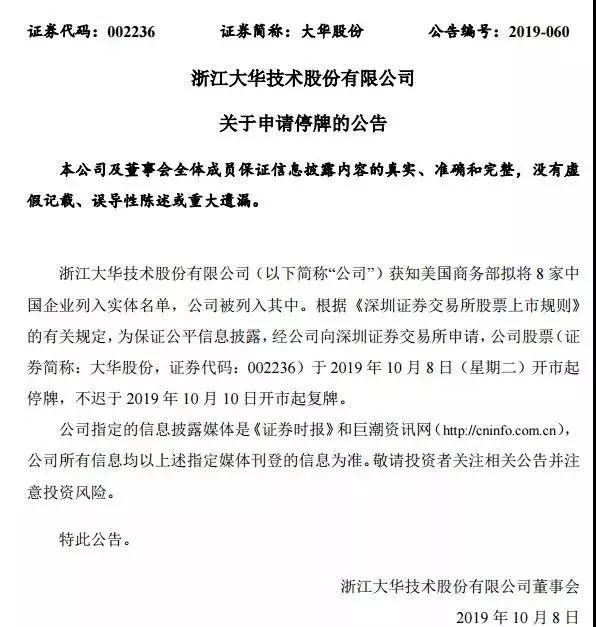 受此消息影响,10月8日开盘前,两大安防巨头大华股份、海康威视就申请了临时停牌。