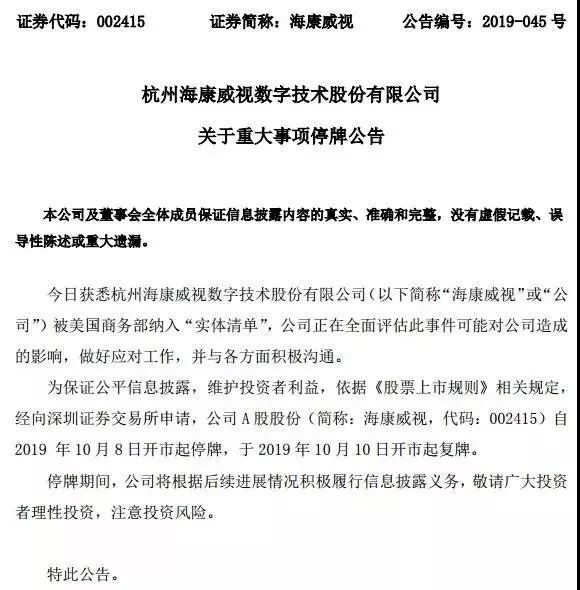 其中,大华股份不迟于2019年10月10日开市起复牌,海康威视则公告称于 2019 年 10 月 10 日开市起复牌。