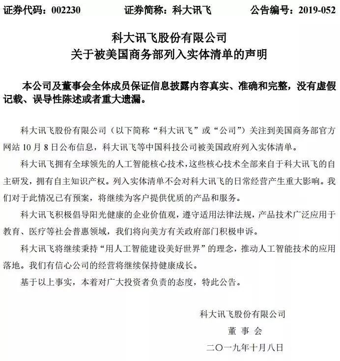 2、科大讯飞:列入实体清单不会对日常经营产生重大影响